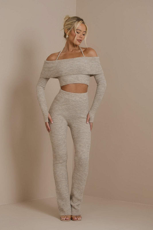 Co-ord Set - Snyggt - Stickad, off-shoulder top, fit byxor - Idealisk för fashionabla tillfällen