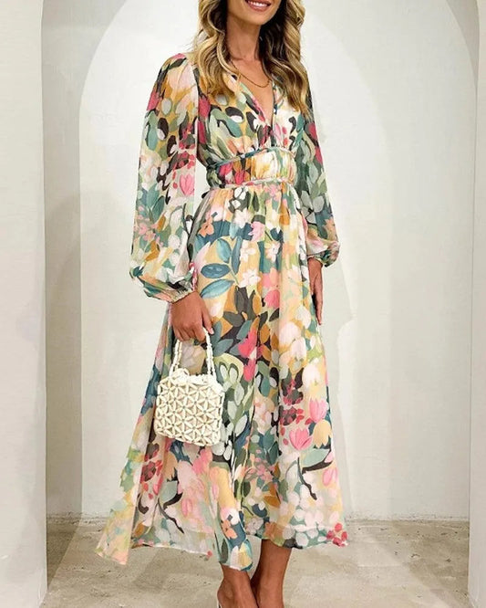 Damklänning - Blommönster - V-ringad, veckad midja, lätt och luftig - Perfekt för vardagliga och formella tillfällen