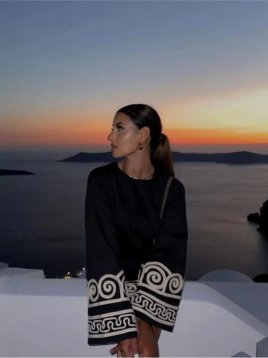 Lång klänning - slående tryck - V-ringad, långa ärmar - Perfekt för olika tillfällen